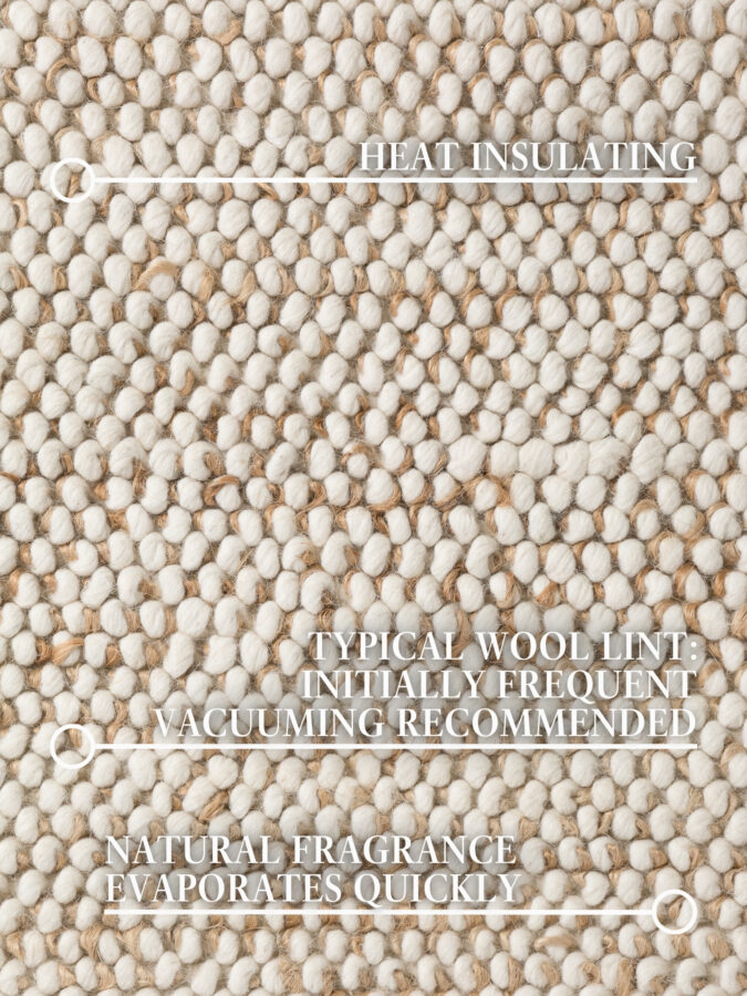 Pure Nature er håndlavet af naturlige materialer som uld, bomuld og jute, hvilket gør tæppet nemt at rengøre, lydabsorberende og varmeisolerende.